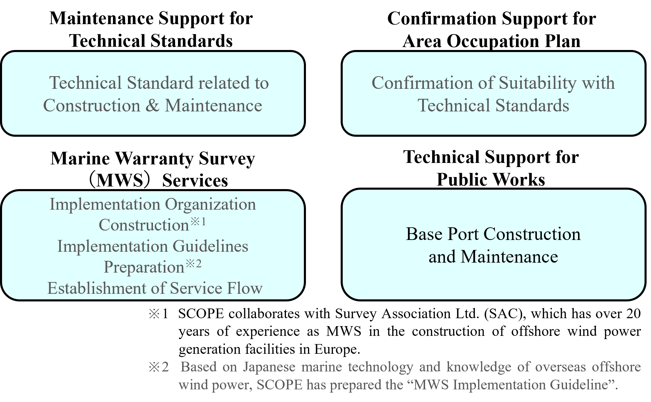 SCOPE is engaging in some services as the following in order to proceed the construction of offshore wind power generation facilities smoothly by utilizing its extensive knowledge and experience in marine construction.