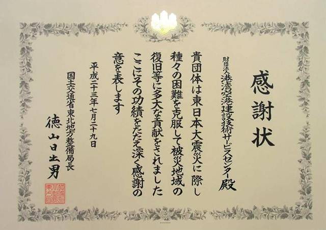 去る7月29日に仙台市仙台国際センターにおいて「東日本大震災関係功労者表彰式」が開催され、当センターを含め東日本大震災の復旧支援に携わった多くの団体に対し国土交通省東北地方整備局長より感謝状が贈られました。