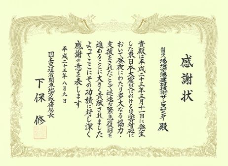 ~東日本大震災復旧支援活動における感謝状を国土交通省関東地方整備局長より拝受いたしました~