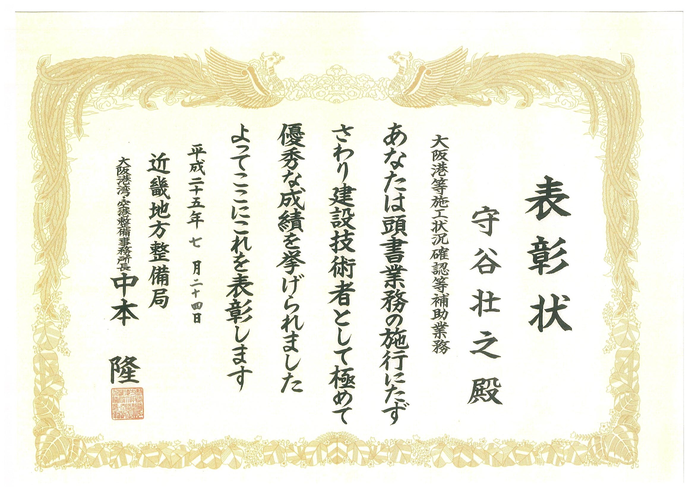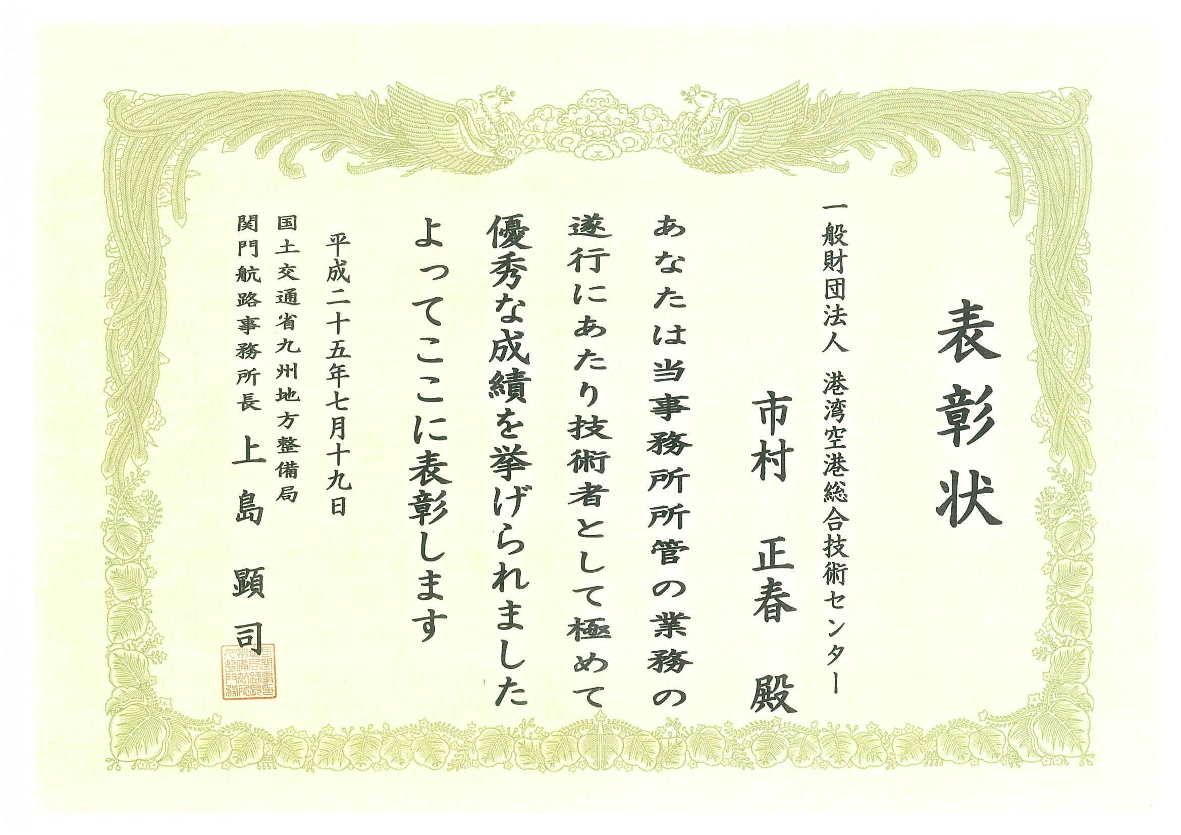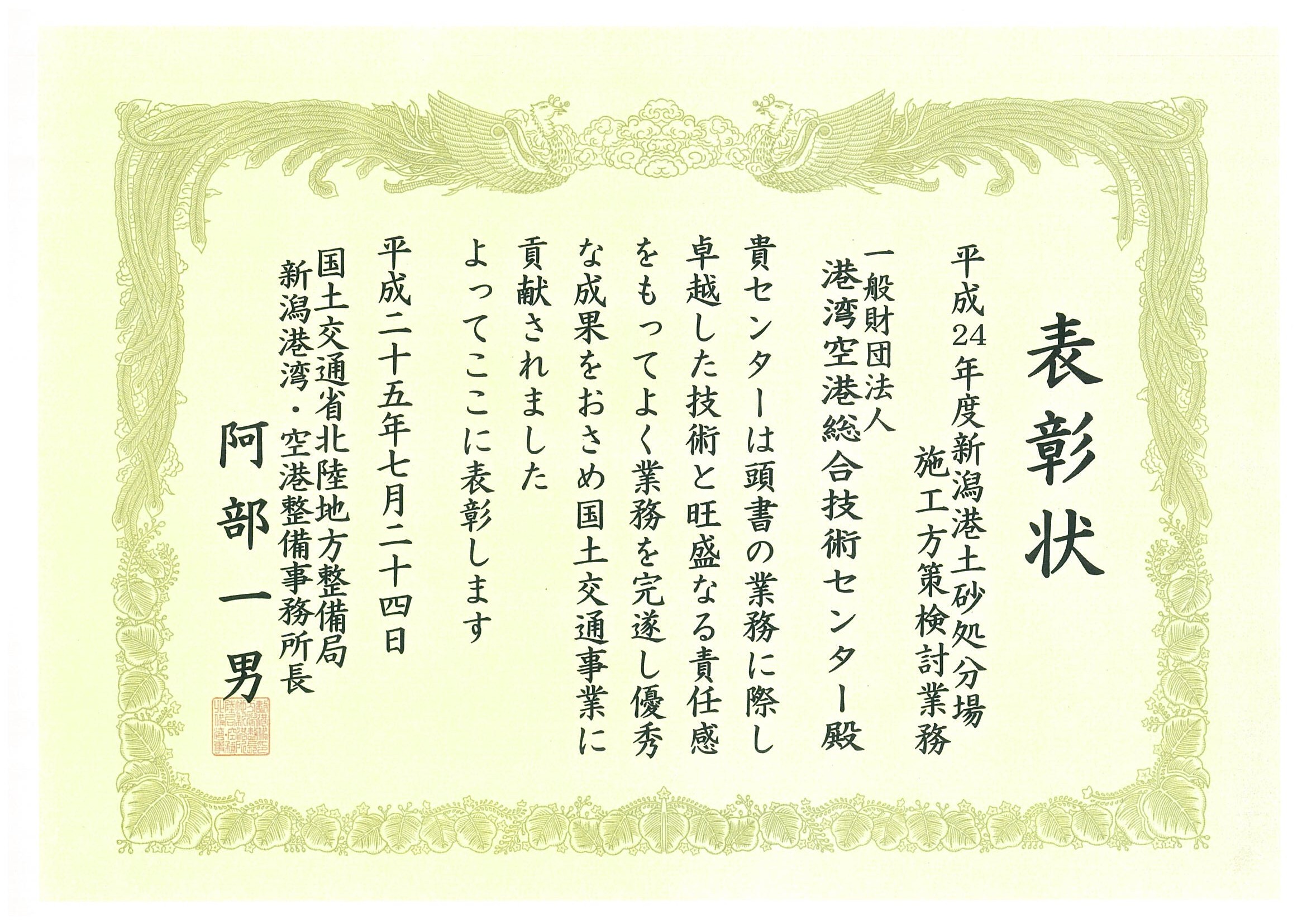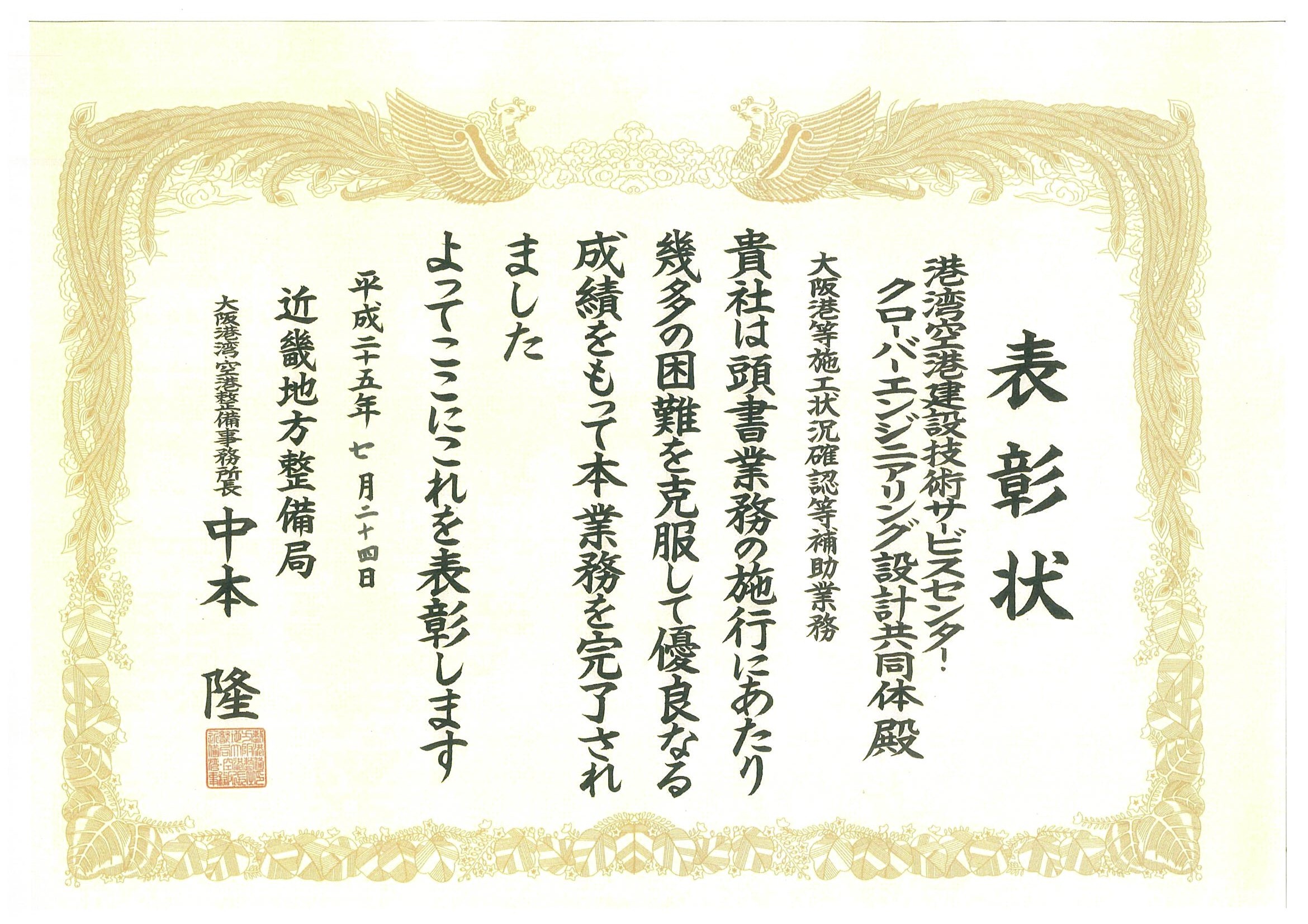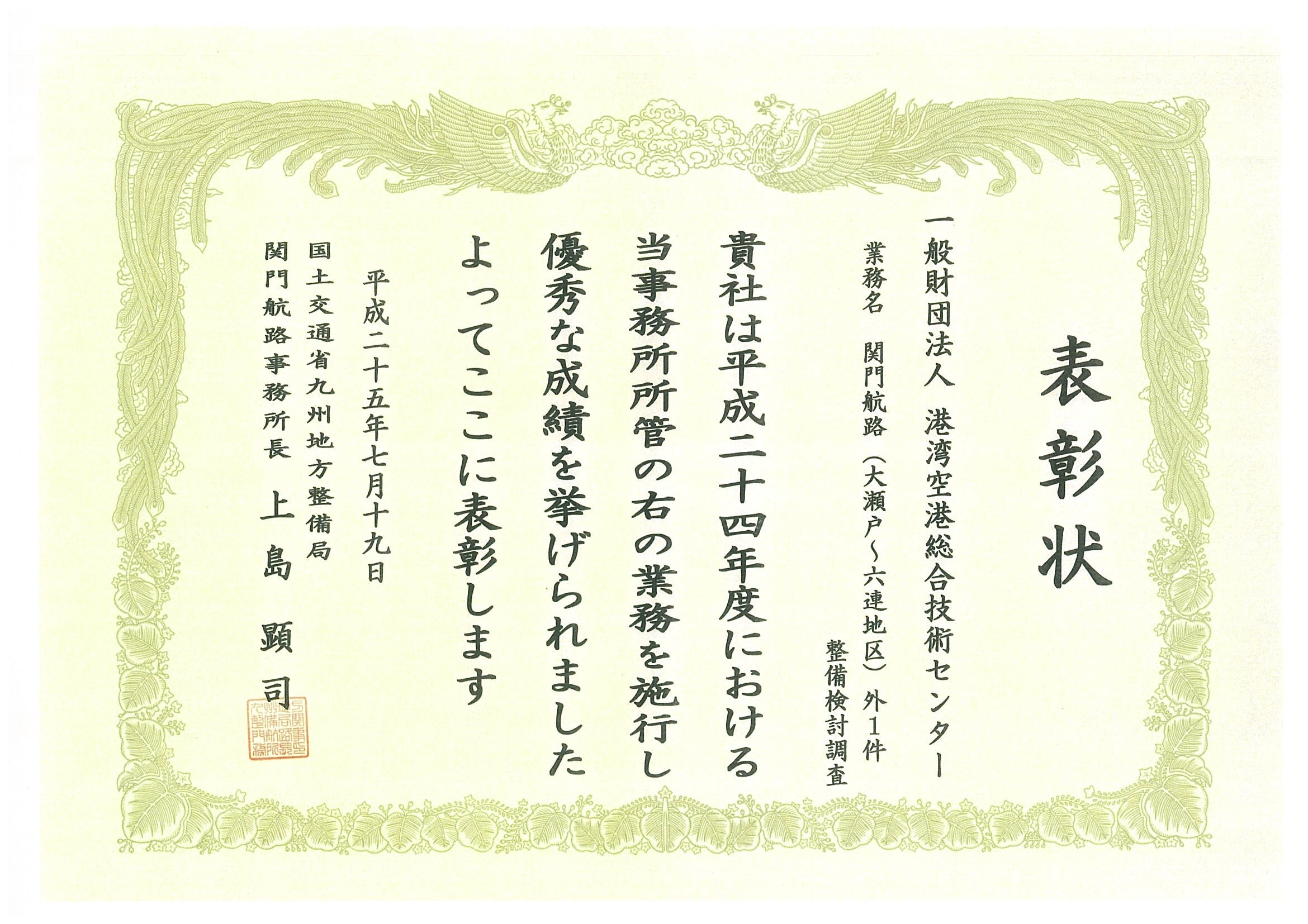 去る7月15日から24日にかけ、各地方整備局において平成24年度に管内の業務で優秀な成果をあげた業務請負団体に対し、局長および事務所長より表彰状が贈られました。