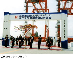 | 広島港国際コンテナターミナル供用開始 中四国で最大級の国際コンテナターミナルの供用開始記念式典が3月19日広島港出島地区で盛大に開催されました。 式典には国土交通省、広島県、広島市の関係者ら多数が出席し、中国地方整備局長、県知事の祝辞があり、テープカットに続き、大型のガントリークレーンが起動し貨物船にコンテナを積み込みました。 岸壁は中国地方整備局がターミナルなどの施設は広島県がそれぞれ施工しました。 岸壁は最大5万t級の船が接岸できる水深(−14m)を確保し、同ターミナル92,400m2[280m×330m(1バース)]の敷地には、大型のガントリークレーン(高さ90m、アウトリーチ45m、最大40,6t吊)2基が設置されています。 現在、広島港の国際定期コンテナ航路は、韓国、中国、台湾などへ5航路が運航されています。 国際コンテナターミナルの供用開始により、大型船の入港が可能となり、非効率な物流も解消され、地域経済の活性化に大きく貢献するものと期待されています。 |