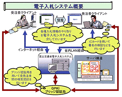 背景 国土交通省では、去る平成15年4月21日から、国土交通省地方整備局等が発注する建設工事及び建設コンサルタント業務等の全てを対象に電子入札を全面的に開始されました。これは、CALS/ECの一環として平成13年10月より開発、試行運用が進められているものであり、インターネットを用いて、競争参加資格の確認申請、確認結果の受理、応札、応札結果の受理、再入札までの一連の作業を行うことができるシステムです。 参加条件を満たす者が誰でも容易に入札に参加することができ、入札に参加するための移動回数が大幅に減少するとともに、書類作成などの業務の効率化を目的としています。 SCOPEと(財)日本建設情報総合センター(JACIC)は、国土交通省が平成13年6月に発表した「CALS/EC地方展開アクションプログラム(全国版)」の趣旨に則り、「電子入札コアシステム開発コンソーシアム」を設立し、国・地方公共団体等の公共発注機関への円滑な電子入札システムの導入を支援しています。