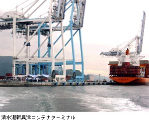 | 清水港新興津コンテナターミナル供用開始 平成15年6月24日、中部地方整備局、静岡県、静岡市主催による清水港新興津コンテナターミナル供用開始の式典が地元衆議院議員をはじめ350名余の方々の出席を得て盛大に行われました。清治中部地方整備局長等主催者の式辞に始まり、村田進大臣官房技術参事官のご挨拶、柳沢衆院議員、草刈日本郵船社長の来賓祝辞、概要説明を片山清水港湾事務所長、岡田清水港管理局長が行い、最後にテープカットで供用の幕が明けられました。清水港コンテナターミナルは我が国最初の24時間フルオープンを行い、さらに浜松にインランドデポを持つなど特異な発展を遂げてきましたが、コンテナ貨物の増大と船舶の大型化に伴い既存の興津、袖師両ふ頭では対応が困難となり今後の対応から新たな国際コンテナターミナルの建設が強く要請されてきました。このため、興津第1ふ頭の東側に新たなコンテナターミナル2Bと防波堤の延伸を計画し、平成11年度に着工しました。岸壁はオーバーパナマックス対応のスーパーガントリークレーンを備えた−15m1バースでハイブリッドケーソンタイプの耐震強化岸壁となっています。なお清水港は三大美港の一つであり霊峰富士を仰ぎ見る景観はことのほか美しく港の色彩計画から今回のコンテナクレーン3基はマリンブルーとホワイトを基調に塗色されており、とても美しい岸壁が完成しました。 |