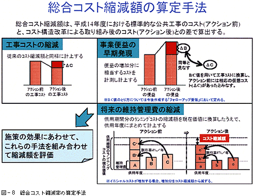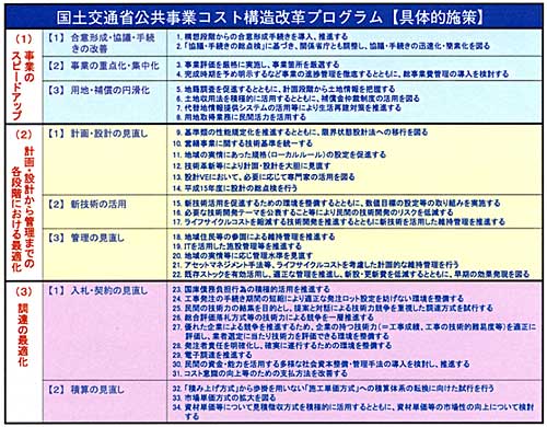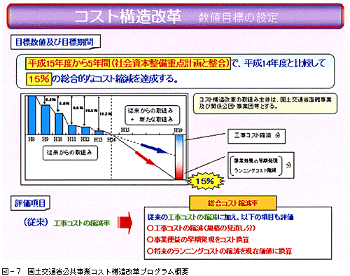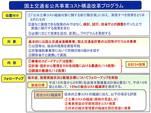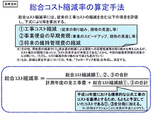 国土交通省における公共事業コスト構造改革の数値目標としては、(1)事業のスピードアップ、(2)計画・設計から管理までの各段階における最適化、(3)調達の最適化を見直しのポイントとし、公共事業のすべてのプロセスを例外なく見直す「コスト構造改革」の取り組みを適切に評価するため、従来からの工事コストの縮減に加え、(ア)規格の見直しによるコストの縮減、(イ)事業のスピードアップが図られることによる便益の向上、(ウ)将来の維持管理費の縮減をも評価する「総合コスト縮減率」を設定し、平成15年度から5年間(社会資本整備重点計画と整合)で、平成14年度と比較して、15%の総合コスト縮減率を達成することを目標としています。