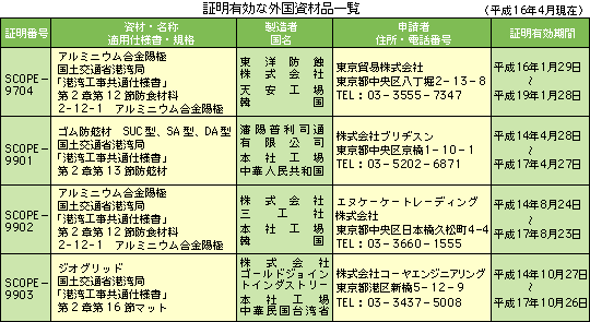 わが国の公共工事のコスト縮減に関する具体的施策の一つとして外国産資材の活用による資材費の低減があります。SCOPEでは、平成9年1月より港湾、空港、海岸工事における外国産資材の活用を促進するため、外国産資材の品質審査・証明を行っています。 1.目的 外国で生産された資材の国内の港湾、空港、海岸工事への導入に際し、適正かつ迅速な審査を行うことによって、建設工事の適正な品質確保及び良品質の外国産資材の活用促進を図ること。 2.適用範囲 品質証明は、建設工事に使用される外国産資材について、各発注者の定める品質基準(仕様書)との適合性の確認を行う。 なお、適合性を確認する品質基準の無い外国産資材についてはSCOPEで定める審査基準に従い品質の確認証明を行う。 3.対象資材 対象とする外国産資材(以下「申請資材」という。)は、港湾、空港、海岸工事に使用される建設資材。 4.審査項目 次の項目について、申請資材の審査を行う。