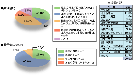 国土交通省の推進する公共事業分野におけるCALS/ECは、入札情報サービス、電子入札、電子納品、工事帳票管理システム等いよいよ本格的な実施段階を迎えました。本イベントはこうした背景のもと、『本格実施で見えてきた“CALS/ECの効果"を体感する2日間』というキャッチフレーズを掲げ、CALS/EC及び建設ITに関わる最新の情報を提供することを目的として開催されました。来場者のアンケート結果からは、大半の方々がCALS/ECの導入、対応に向けた情報収集を来場の目的とされており、これらの方々に対し、本展示会が充分に満足していただけるものであったことが見てとれます。また、来場者の内訳表によると、ソフトウェアメーカ-に次いで地方自治体関係者の割合が高くなっており、CALS/ECの全国展開に向けた機運の高まりが感じられます。◆展示会来場者アンケート結果(サンプル数:201) ![]() |