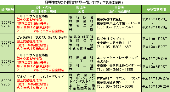 平成16年4月、「港湾工事共通仕様書」(国土交通省港湾局)が改訂になったことから、これに合わせてSCOPE NET vol.32でご案内した「証明有効な外国資材品一覧」のうち、適用仕様書を訂正いたします。