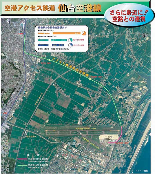 | 東北の拠点空港、進む仙台空港アクセス鉄道整備 1.仙台空港の概要 現空港は昭和15年に現A滑走路を建設、昭和40年代には増大する航空需要に対応したB滑走路の新設に着手し、昭和47年に2,000mで供用以来、平成10年の3,000mでの供用開始まで、大型ジェット機に対応した整備が進められ、東北と海外を結ぶ拠点空港として十分機能できる空港となりました。一方、平成11年5月には、東北の空港として初めて国際定期貨物航路の開設、エプロン12バースの供用開始、新貨物ターミナルが全面供用となり、運用時間も平成14年には14時間に延長されなど、より一層利便性が高まり使いやすい空港となっています。 現在就航路線は、全国主要都市間に11路線・35往復/日、7往復/週、国際線は6路線・24往復/週の定期便が就航しています。 更なる利便性の向上を目指し空港アクセス鉄道の整備が進められています。 2.アクセス鉄道の整備概要 仙台空港アクセス鉄道は、昭和59年の仙台地方陸上交通審議会答申で「仙台空港への鉄道アクセスの可能性を検討」以来、平成3年に国、県、関係市等で構成する「検討会」が発足、平成11年4月東北地方交通審議会において「JR名取駅から仙台空港に至るルートの早期着工」旨の答申、平成12年4月に事業化され6月には仙台空港鉄道(株)が「第一種鉄道事業認可」を取得、以降随時工事施行認可を取得、平成14年12月に空港敷地内の1.1kmについて工事が着工されました。 【計画概要】