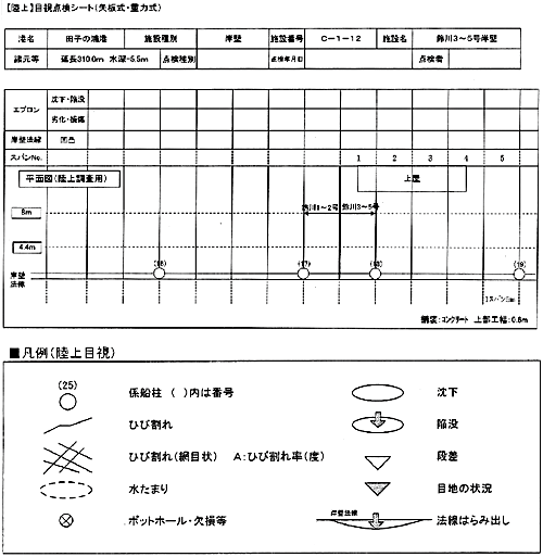 | 目視点検シート(部分)。係船注に番号を付し、スパンを切っている。 目視により確認された状況を凡例を基に記入していく。 |