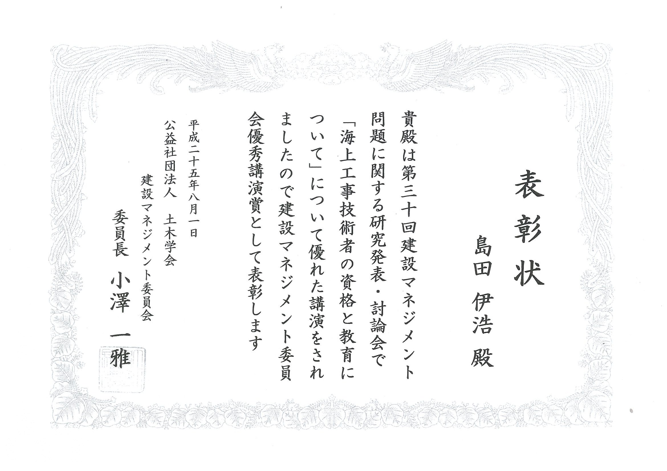 当センター 審査・認定部 島田主任研究員が、土木学会 建設マネジメント委員会「優秀講演賞」を受賞しました。この賞は、建設マネジメント分野の学術的・技術的・実務的な発展に資するため、土木学会 建設マネジメント委員会が、主催・共催する行事で発表または講演し、その内容が優れた者に表彰を授与されるものです。